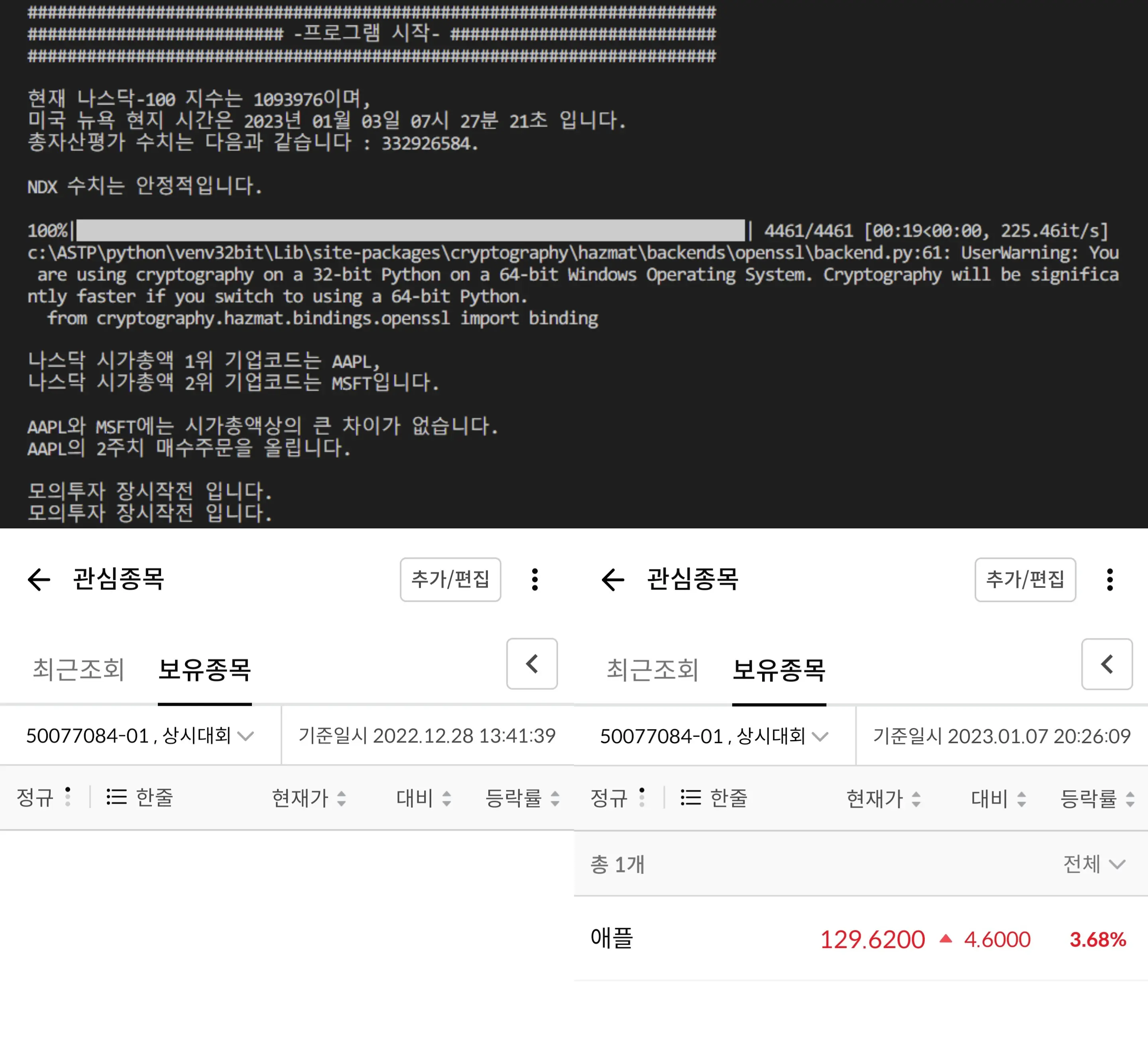 프로그램 예시 동작과 프로그램 통해 애플 1주를 매수한 화면