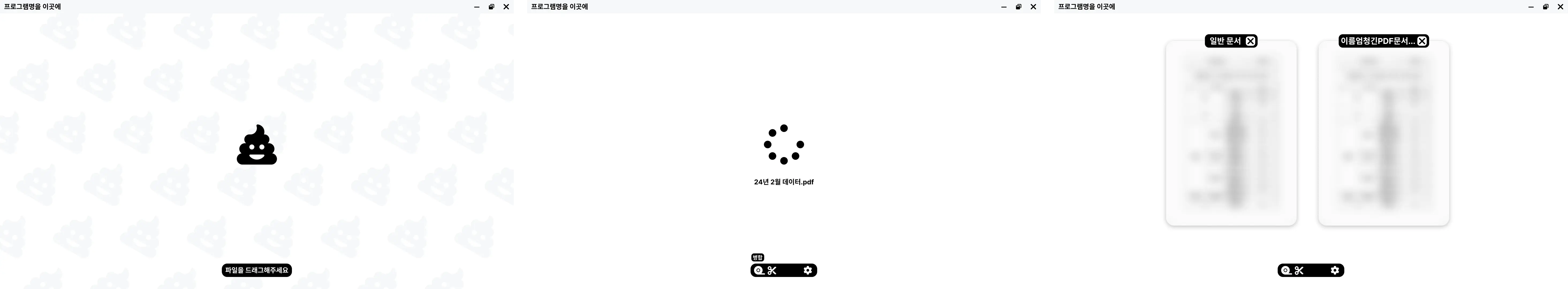 Pascal은 PDF 병합, 분할 작업을 수행해주는 프로그램입니다. 사회복무 기간 중 2달가량에 걸쳐 개발되었으며, 정말 운 좋게도 개발자를 지망하는 동료 사회복무요원이 있어 근무 중 남는 시간에 전용 노션 페이지를 열고 작은 협업을 진행했습니다. 원래는 PDF 텍스트 추출, JPG 변환, 압축 등 여러 개 사무 관련 기능을 이 프로그램에 통합하여 사용할 계획이었으나, 진로상의 이유와 얼마 남지 않은 복무 기간을 고려해 기초적인 기능 몇 가지만 구현하고 마무리했습니다.