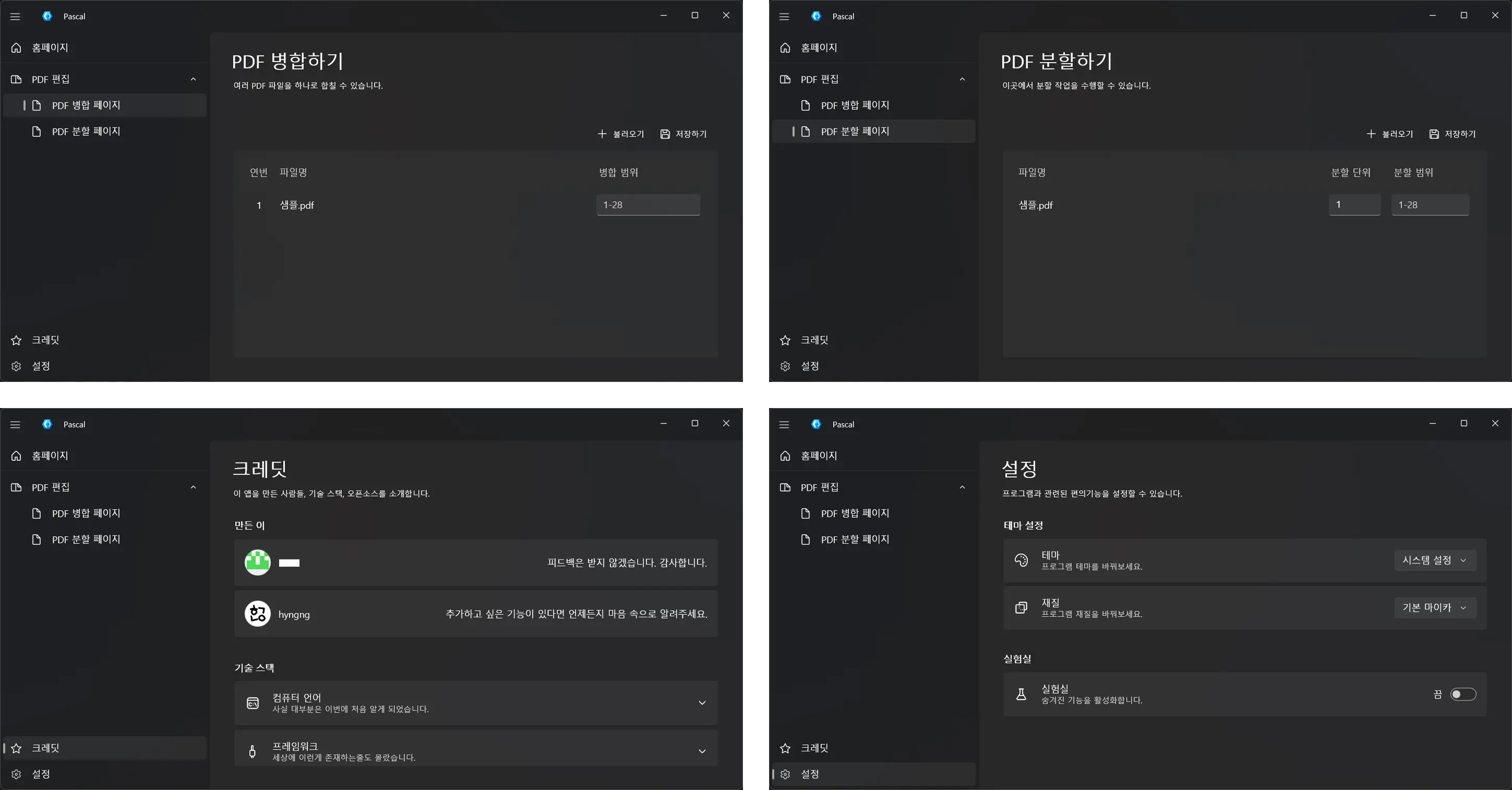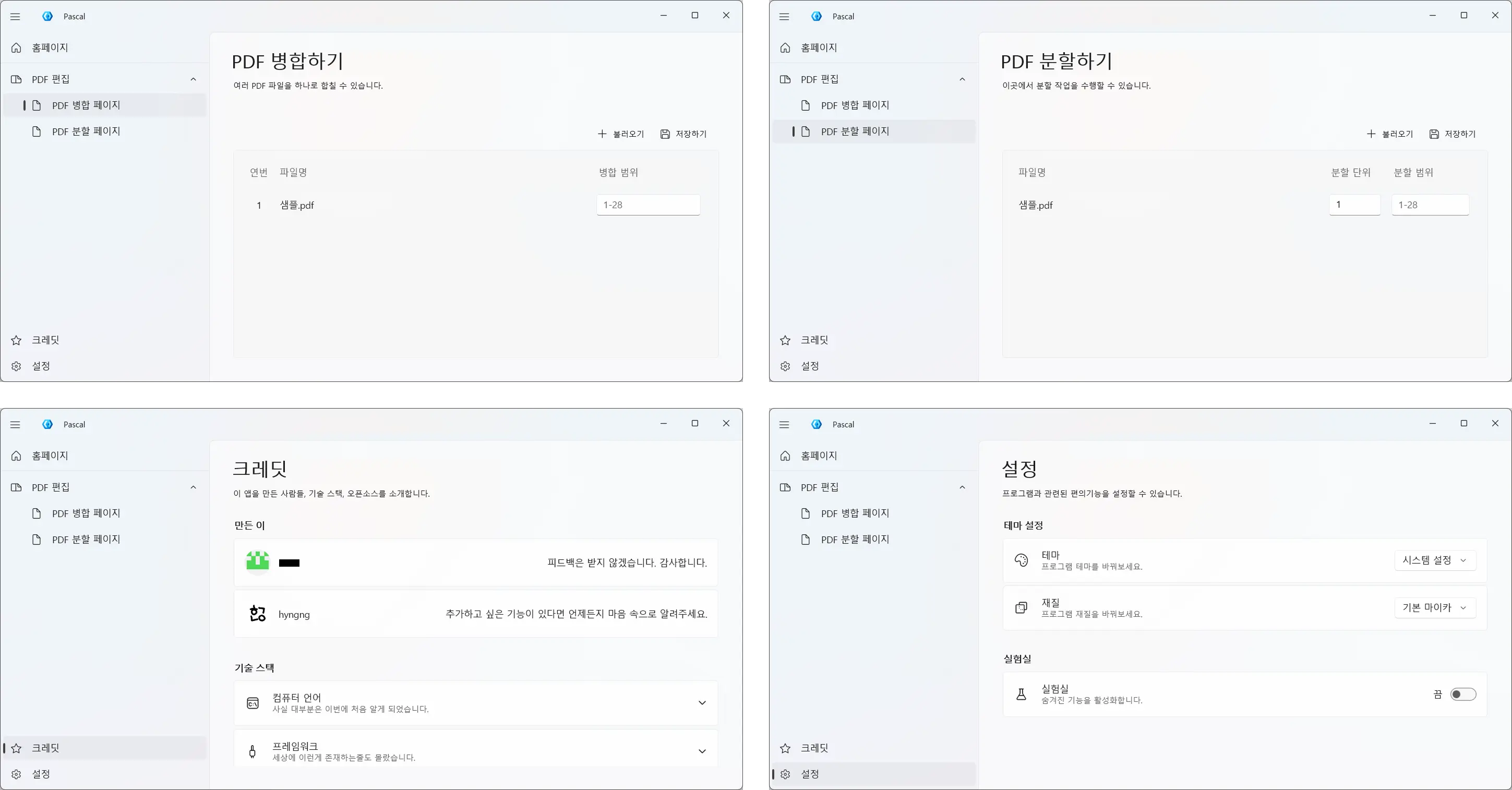 프로그램 이름이 Pascal인 이유는 최초로 PDF 압축 기능을 목표로 개발을 시작했기 때문입니다. 압축 기능은 수지타산이 맞지 않아 구현되지 않았지만 PDF 파일 조작이라는 맥락은 살아남아 병합과 분할 두 가지 기능 구현으로 이어졌습니다.